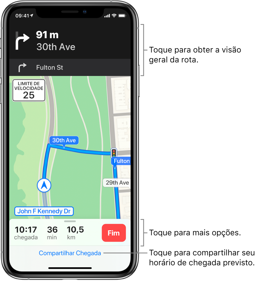 Para encerrar o itinerário a qualquer momento, toque em Fim ou diga à Siri algo como “Parar a navegação”.