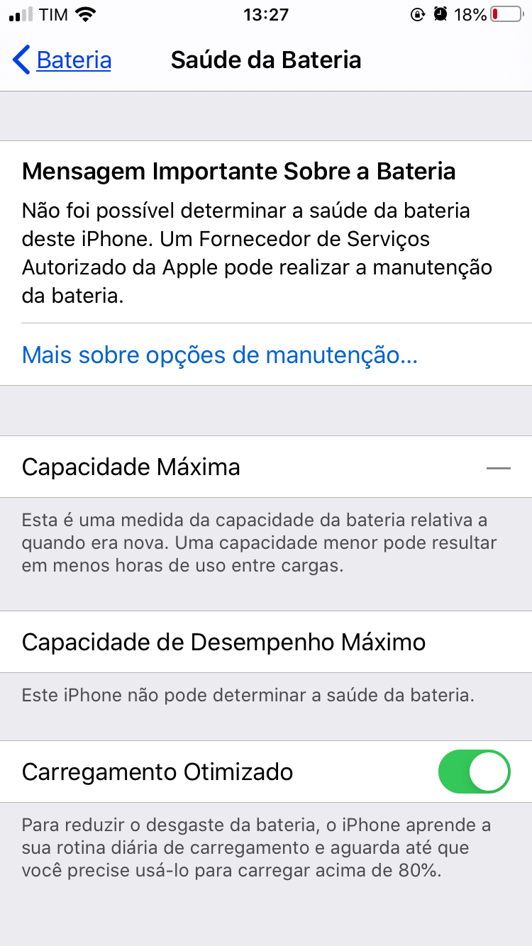 Não foi possível determinar a integridade da bateria deste iPhone. Um Fornecedor de Serviços Autorizado da Apple pode realizar a manutenção da bateria. Mais sobre opções de manutenção…