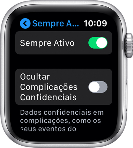 A opção Sempre Ativo tem ajustes que permitem desativar o recurso, o que aumenta a duração da bateria. Também é possível ocultar complicações confidenciais.