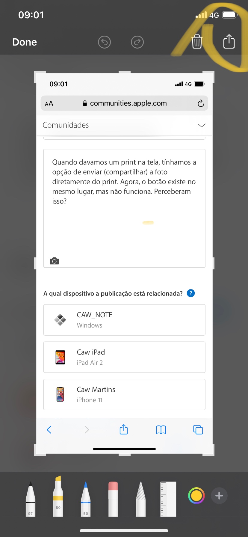 Quando davamos um print na tela, tínhamos a opção de enviar (compartilhar) a foto diretamente do print. Agora, o botão existe no mesmo lugar, mas não funciona. Perceberam isso?