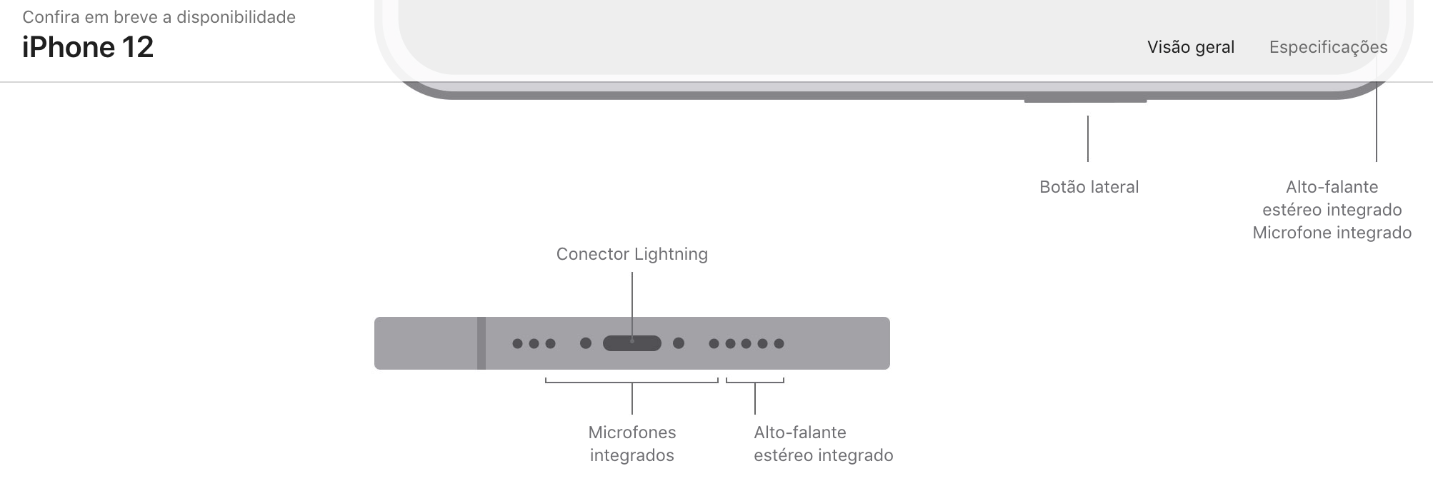 O iPhone 12 tem o conector lightning - então dá pra usar fones com esta entrada ou você pode usar um adaptador de Lightning para conector de fones de ouvido de 3,5 mm se precisar.