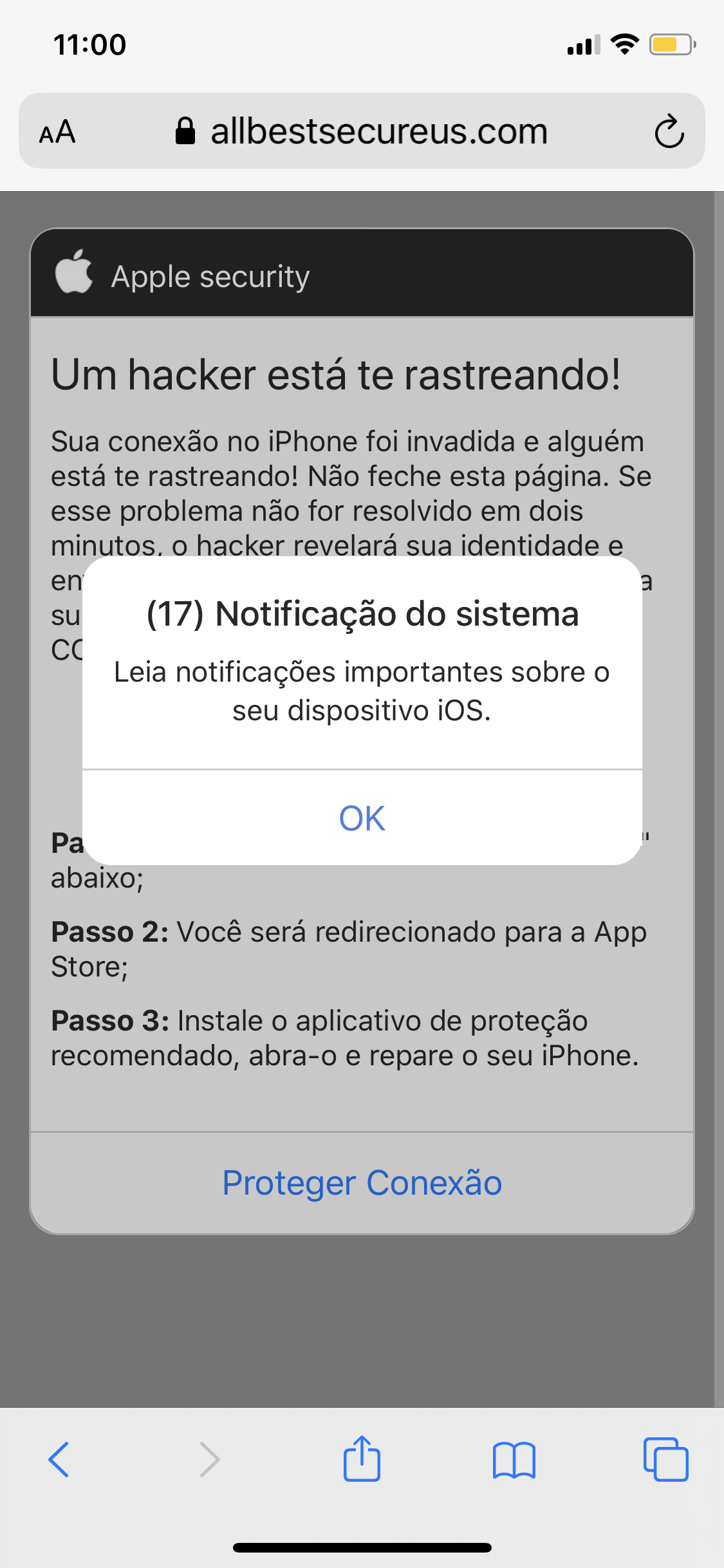 (17) Notificação ativa - No Safari recebi a mensagem “Um hacker está te rastreando!”