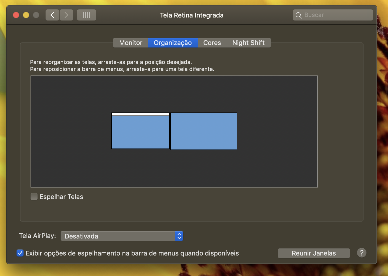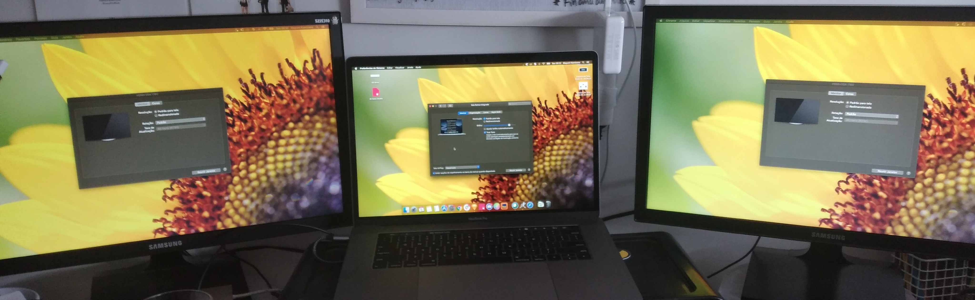 Por 30 min, o macbook reconheceu o monitor 2 (HDMI) e 3 (VGA), mas como sendo um único monitor, e espelhava o conteúdo do mesmo (ver imagens). Agora, não reconhece mais nenhum monitor externo. Por favor, me ajudem!