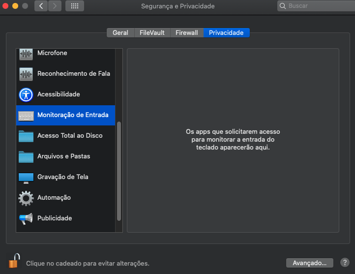 Já fiz todos esses procedimentos mais de 5 vezes e continua igual. Na aba Privacidade somente o item "Monitoração de Entrada" não tem qualquer aplicativo, as demais, os apps Wacom estão presentes.