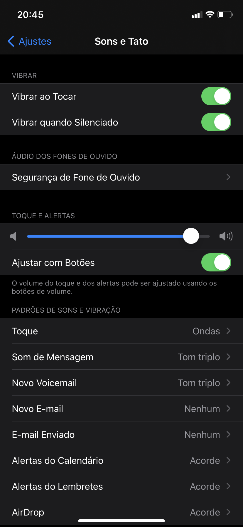 Meu iphone não vibra de jeito nenhum, mesmo tudo estando ativado(como nas fotos). Apenas sinto um bem leve vibrar quando ativo o silencioso, mas durante a ligação ou quando era pra vibrar ele não vibra. Será que é defeito?????