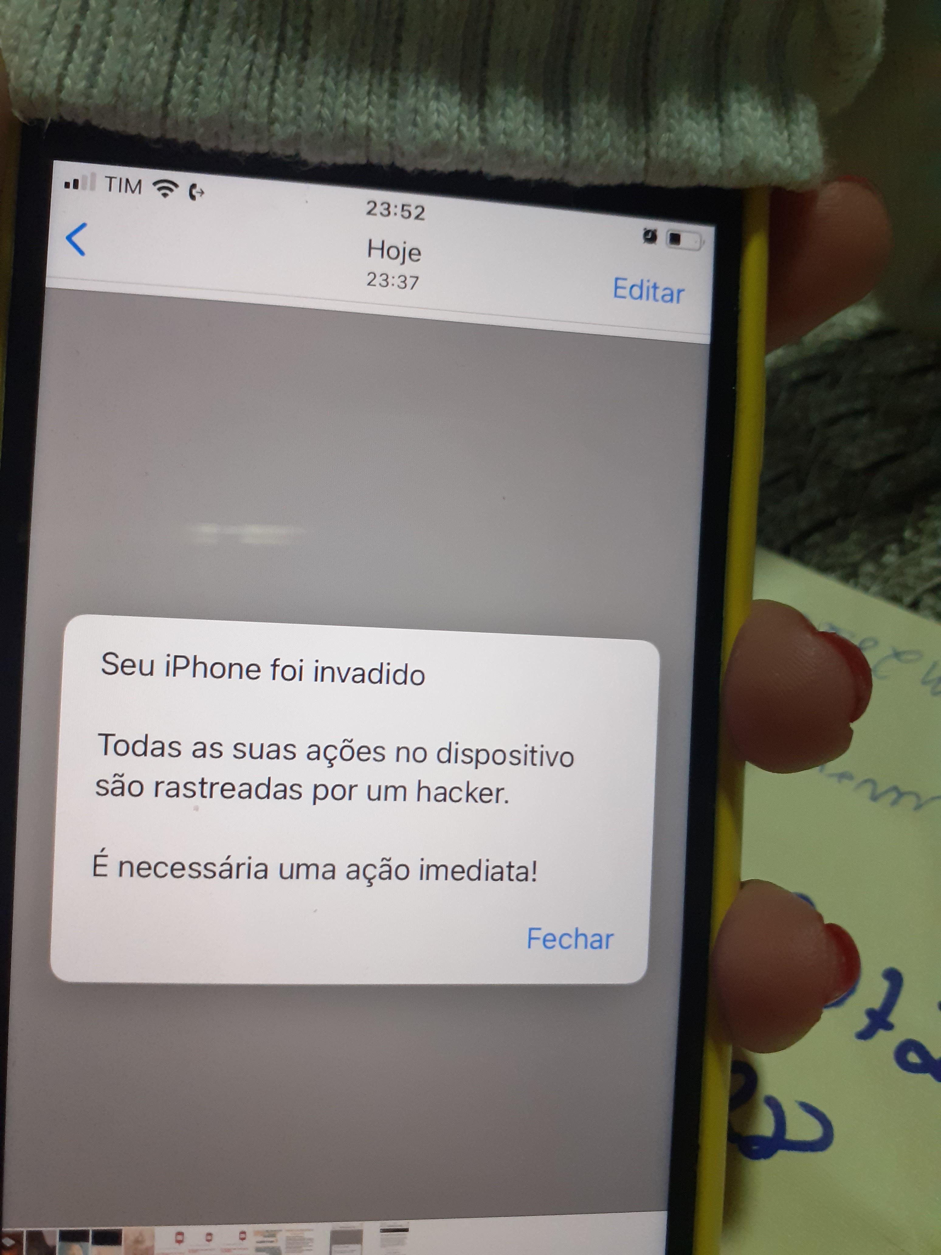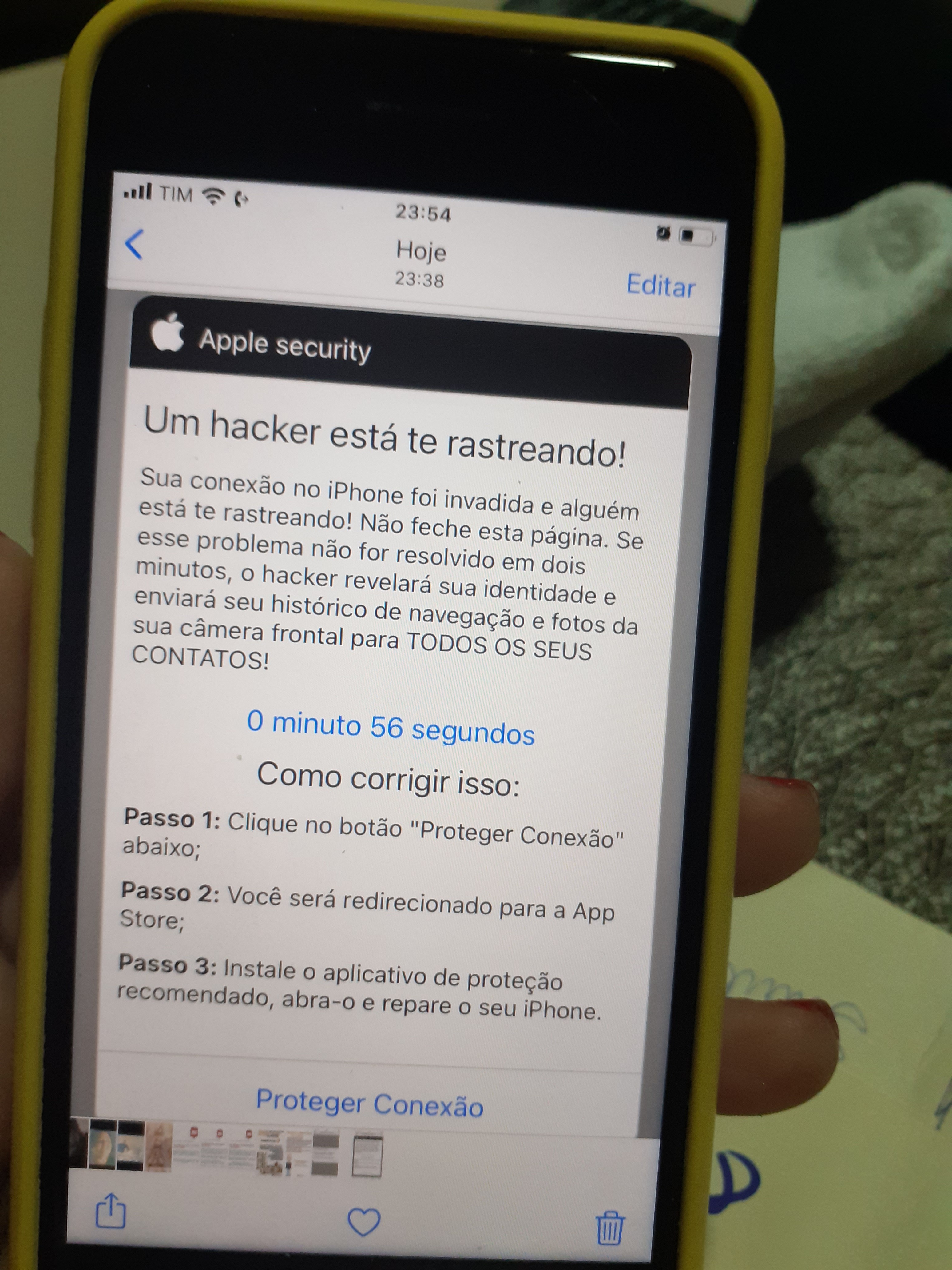 Recebi uma msg que meu iPhone foi invadido ,falando q seria necessário uma ação imediata. Pedindo pra esperar 2 minuto q o hacker entraria q eu deveria apertar proteger conexão.... o que está acontecendo .