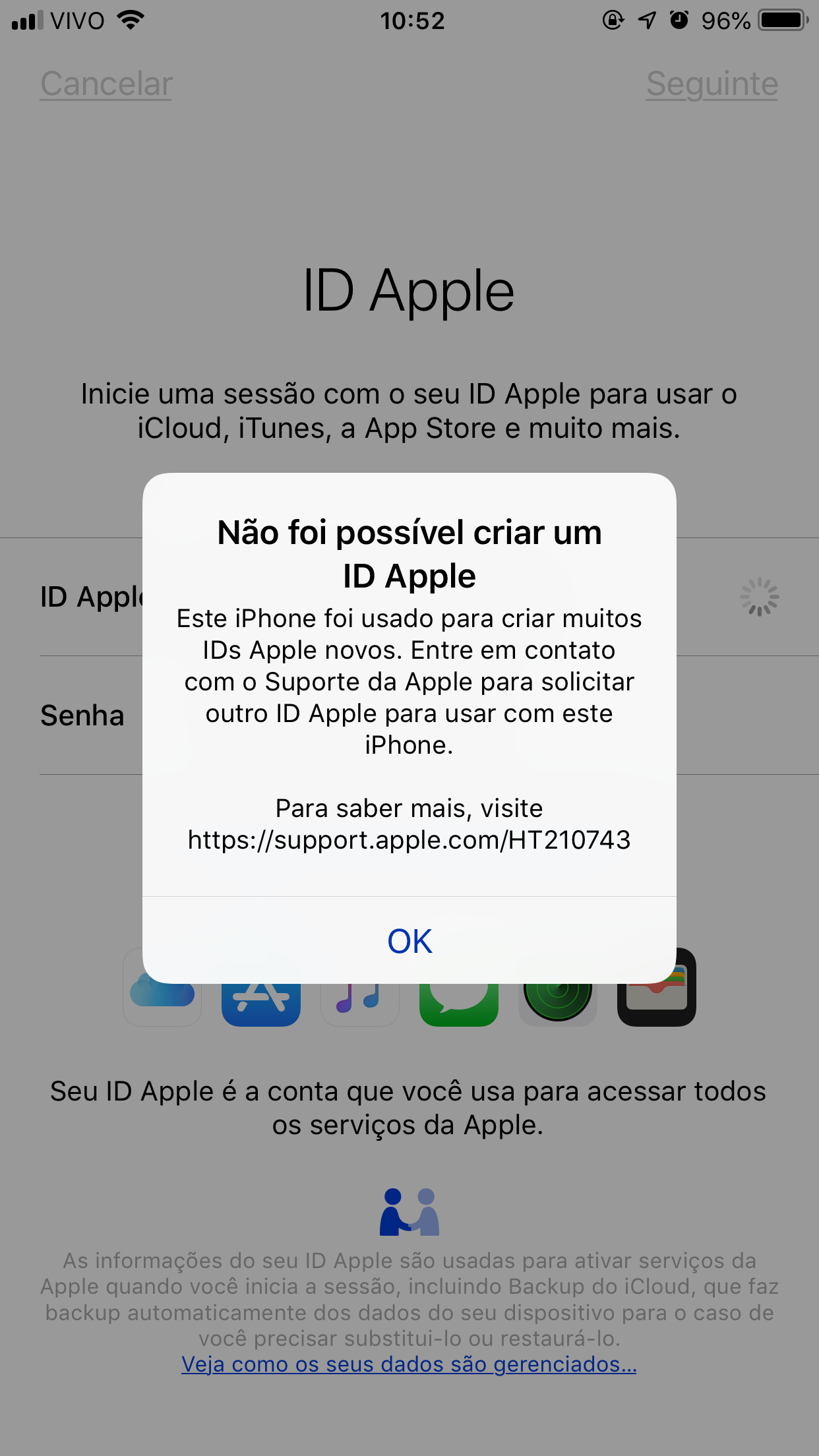 Não consigo criar um id Apple no meu iphone