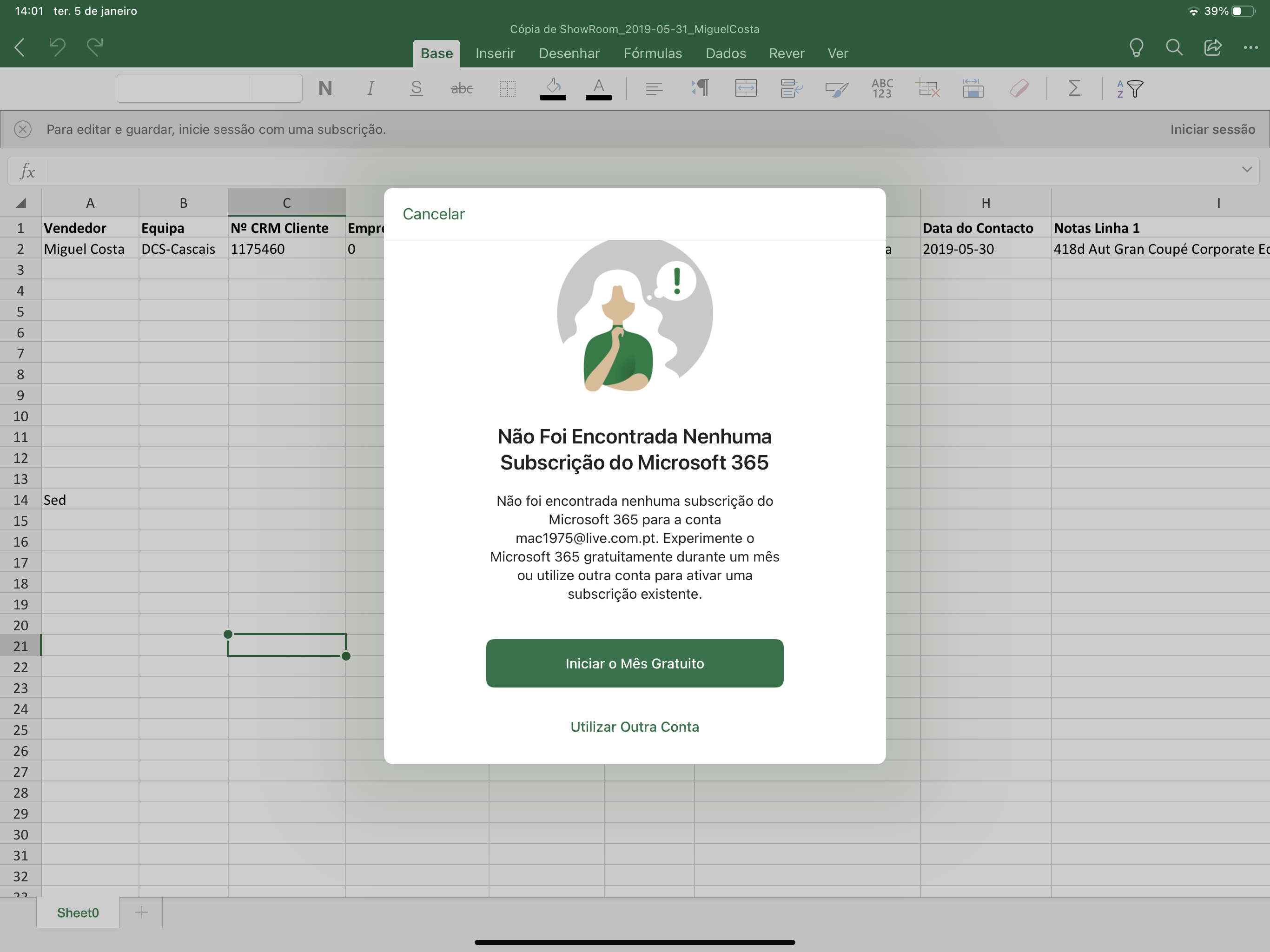Acontece que agora ao abrir um ficheiro de Excel ele visualiza mas não me deixa alterar nada, no entanto em cima aparece esta informação “PARA EDITAR E GUARDAR, INICIAR SESSÃO COM UMA SUBSCRIÇÃO”, clicu no iniciar sessão e coloco o meu email que já usava e password, no entanto continua sem dar.