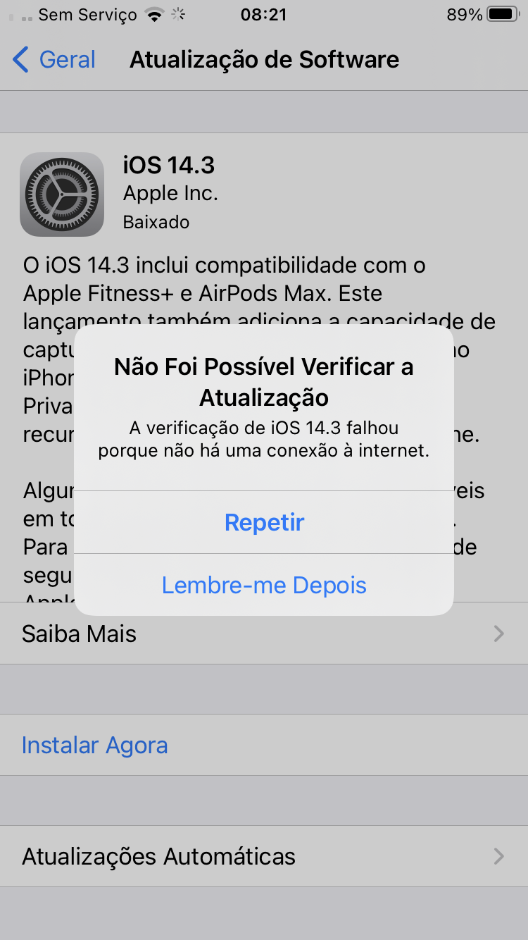 não consigo baixar a atualização, da um erro de q não estou conectado a uma rede Wi-Fi sendo q estou conectado.