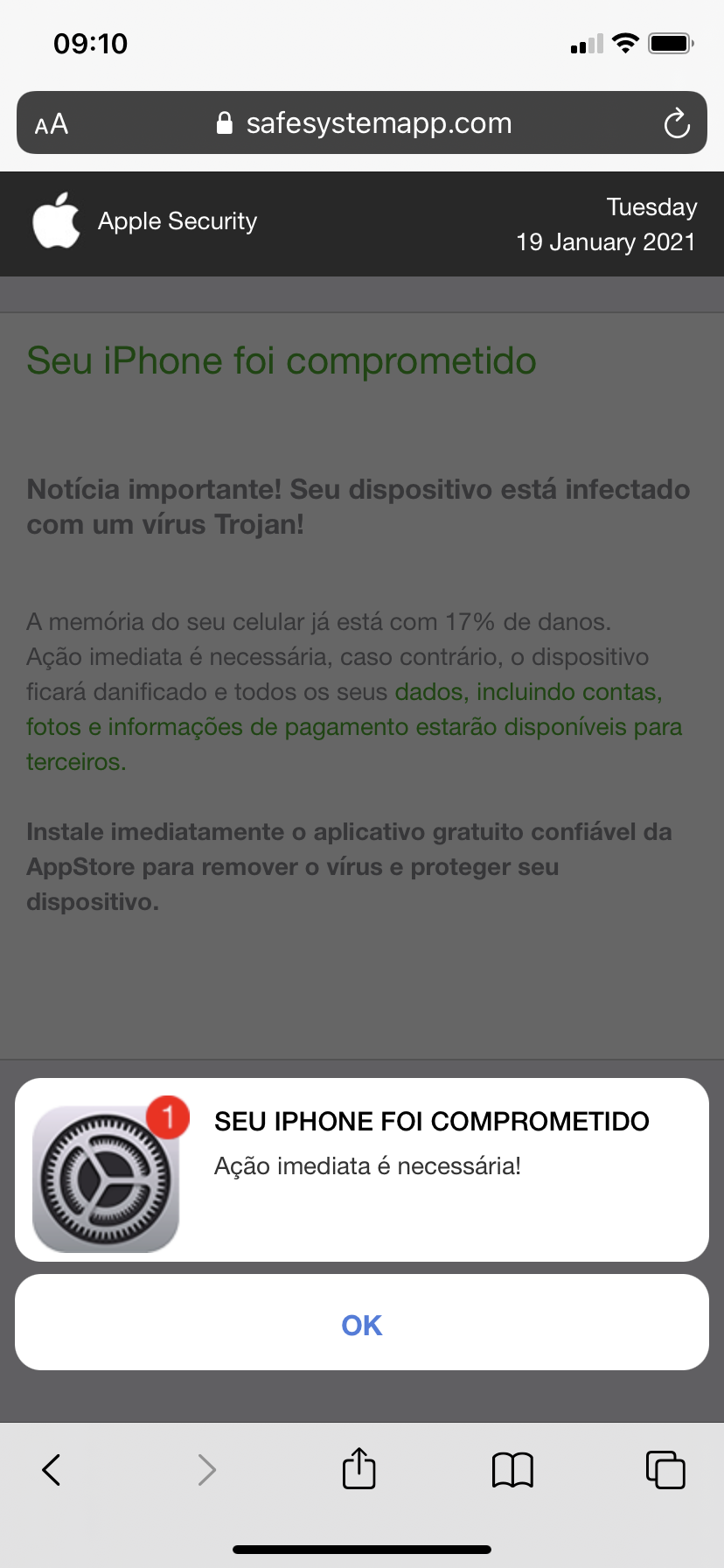 Recebi agora uma mensagem durante o uso do Safari , dizendo que meu celular está com vírus Trojan e j está com 17% de danos . Como faço pra saber se é fraude .