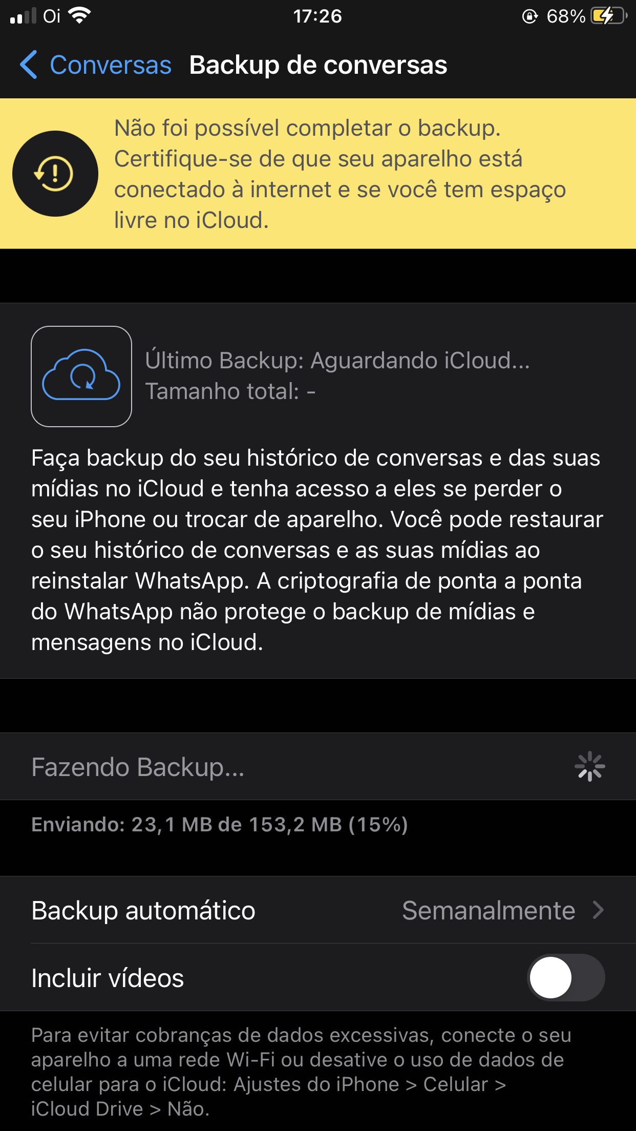 Já instalei e desinstalei varias vezes, mas não faz o backup de jeito nenhum e só fica nisso. Isso pq estou no Wi-Fi. Como posso resolver isso? Aumentei até o gb para 50, para ver se conseguia e nada.