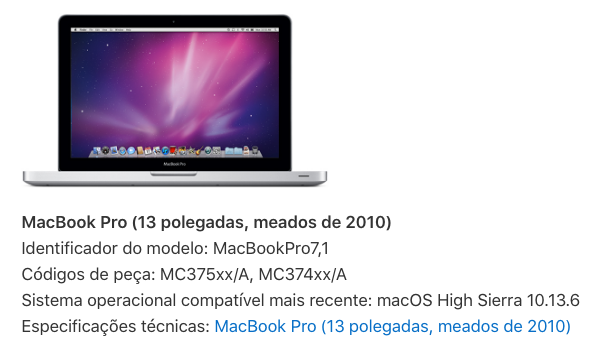 Tenho um Macbook pro meados 2010 13", no site da apple ele informa que a versão suportada seria o High Sierra, mas ele não aparece quando eu abro o App Store. O modelo do meu Macbook é MacBookPro7,1 conforme a imagem abaixo