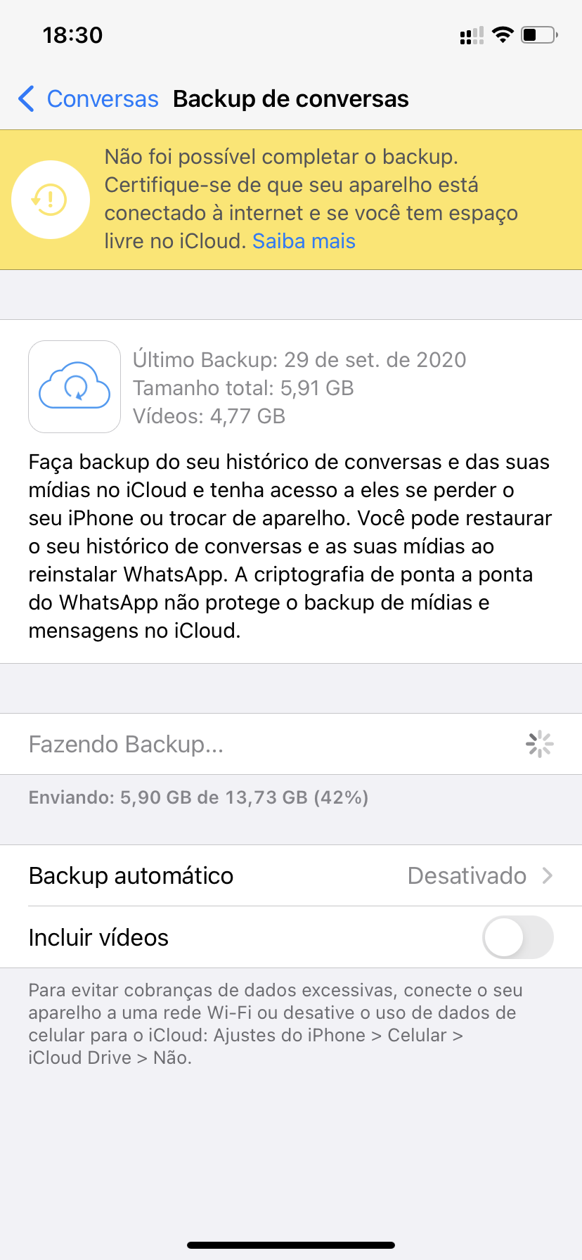 Não estou conseguindo fazer backup do WhatsApp no meu ICloud. Já exclui e inclui o item mas o sistema não completa o carregamento do backup.
