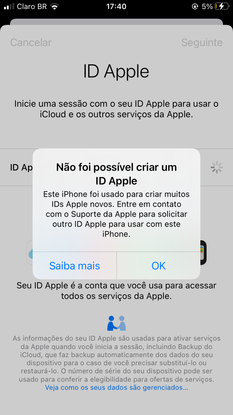 O artigo Se você receber a mensagem "Não foi possível criar o ID Apple" ou "Could Not Set Up iCloud" (Não foi possível configurar o iCloud) traz passos que podem te auxiliar.