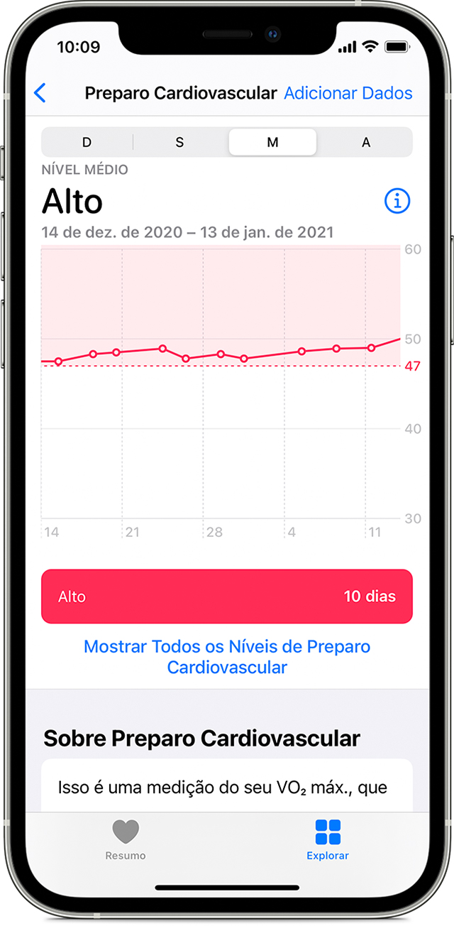 Se os níveis de preparo cardiovascular estiverem baixos para sua idade e sexo, você receberá uma notificação. Se os níveis continuarem baixos, você receberá mais notificações.