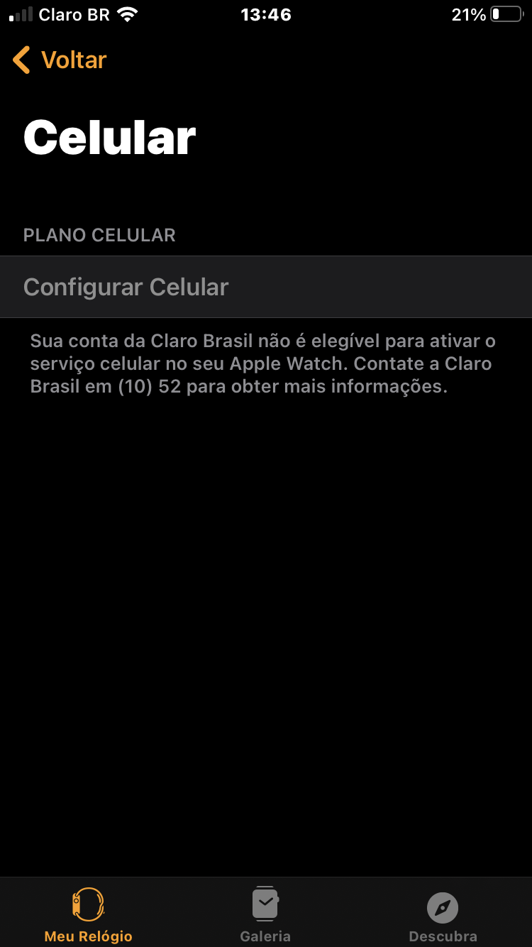 Sua conta da Claro Brasil não é elegível para ativar o serviço celular no seu Apple Watch. Contate a Claro Brasil em 1052 para obter mais informações.