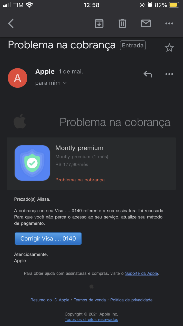 Boa tarde, como faço para cancelar uma cobrança irregular de vocês? Estavam cobrando no meu cartão valores de algo que eu não contratei. Instalei um antivirus que dizia ser grátis por um período e depois poderia cobrar R$ 179,90, mas eu não contratei isso. Imagina pagar R$ 179,90 POR MÊS por um antivirus?? Não tem nem cabimento. Eu não sequer achei mais o app que seria desse antivirus.