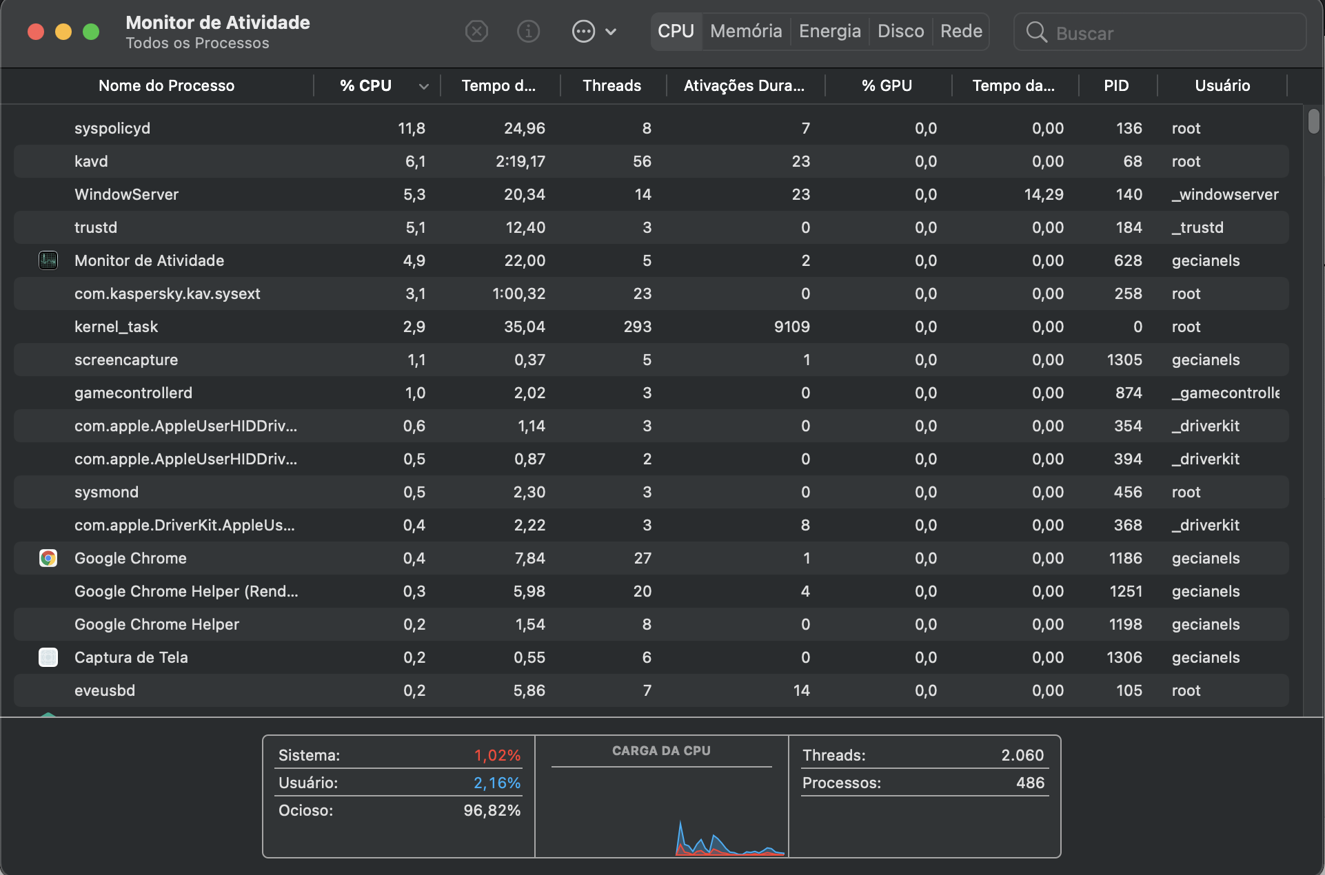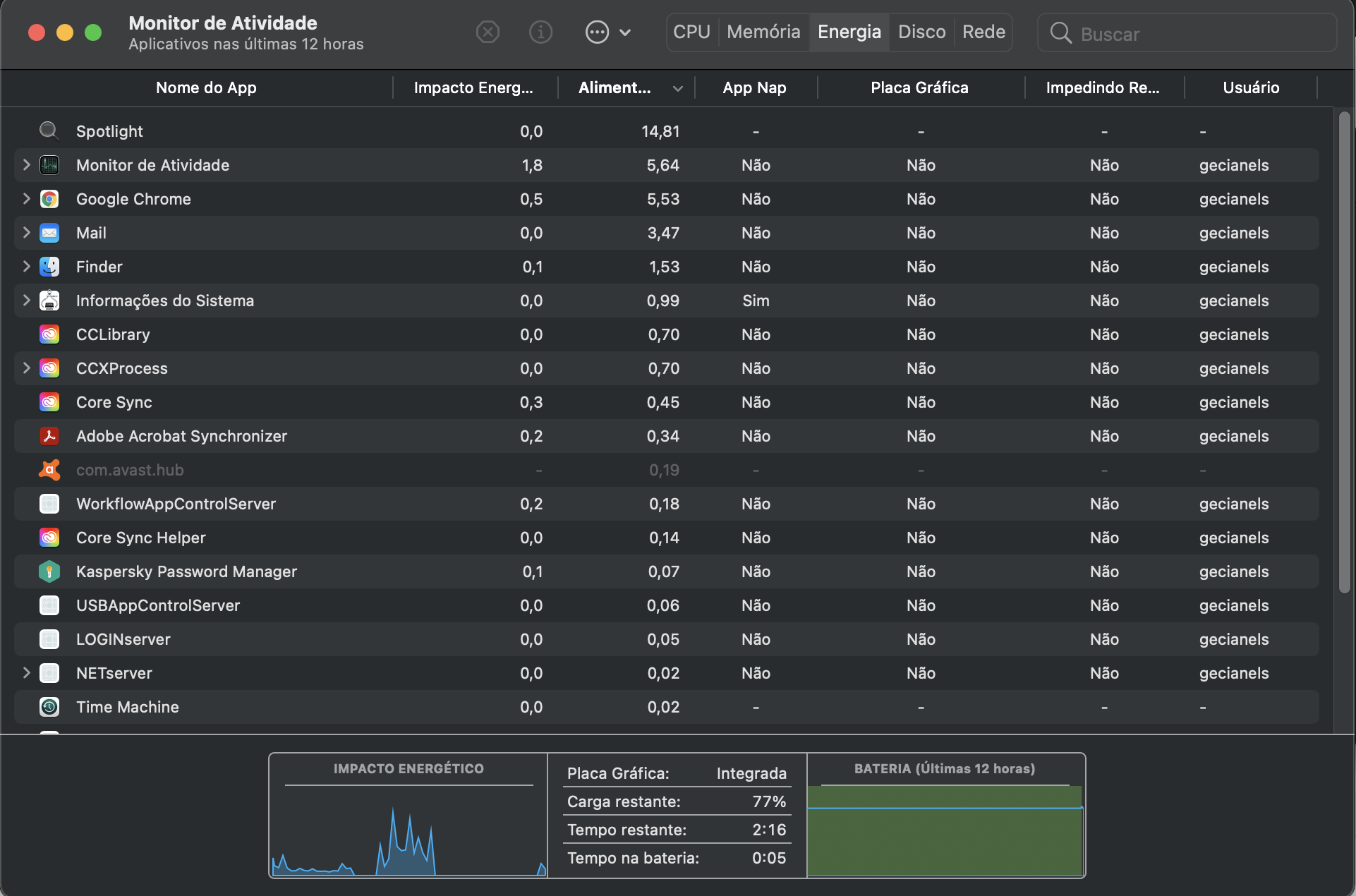Olá! Tenho um MacBook Pro (16-inch, 2019) que foi adquirido no início desse ano e a bateria não dura nem 3 horas, utilizando programas como Chrome, Whatsapp, etc, ou seja não são programas pesados. Já vi que a bateria está com a saúde normal, o número de ciclos é 15 e a Capacidade de Carga Máxima é 7886 mAh, além de que o macOS Big Sur é o 11.3.1 (20E241).