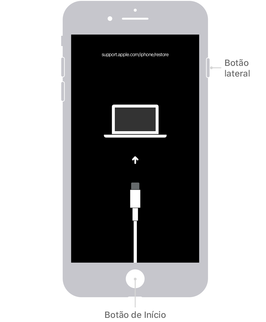 Mantenha o botão lateral pressionado até que o controle deslizante Desligar apareça. Arraste o controle para desligar o iPhone. Em seguida, conecte o iPhone ao computador, mantendo o botão de Início pressionado. Mantenha o botão de Início pressionado até que a tela do modo de recuperação seja exibida.