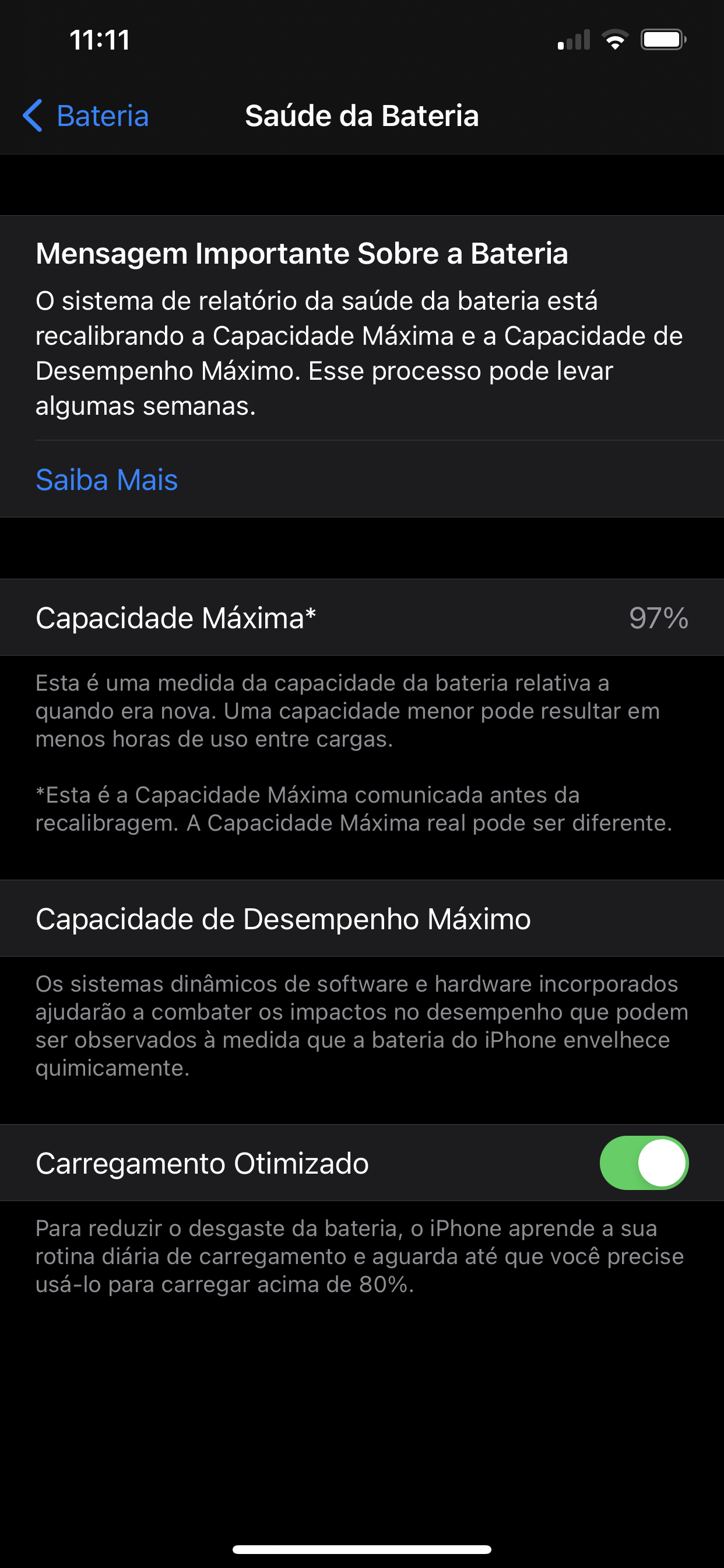 O sistema de relatório da saúde da bateria está recalibrando a Capacidade Máxima e a Capacidade de Desempenho Máximo. Esse processo pode levar algumas semanas. Saiba mais...
