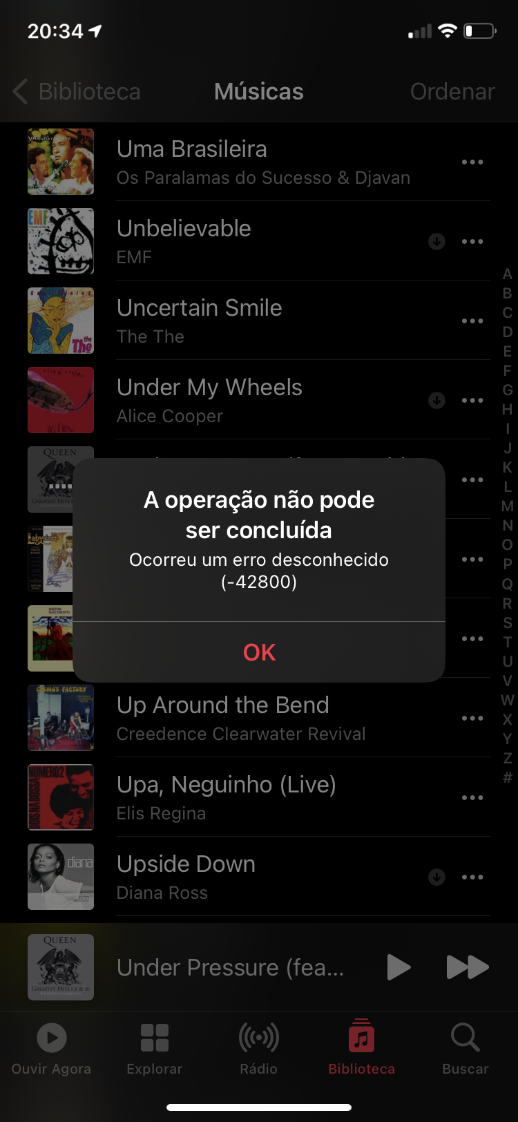 Mas agora apareceu essa: Um tal de erro desconhecido 42800 impede da música tocar.