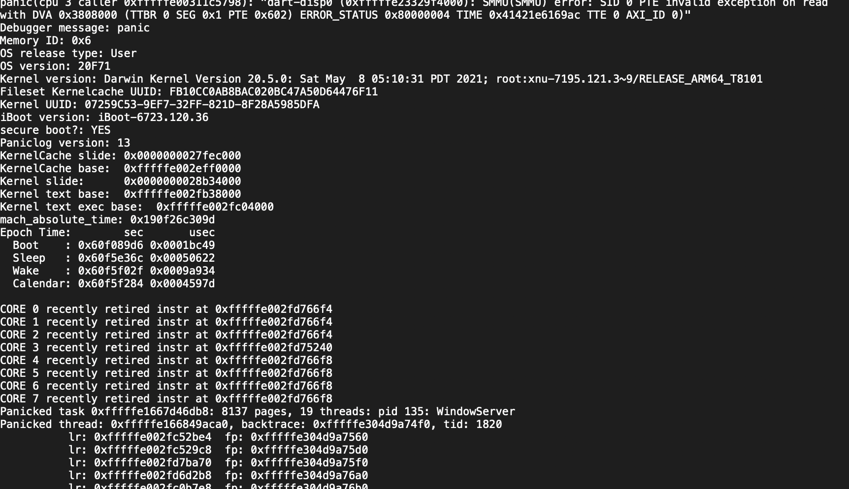 Eu comprei tem 1 semana o novo MacBook Air M1 2020 e hoje quando coloquei ele para carregar e abri ele, do nada ele fica com uma tela preta e listras rosas. Estou assustado porque ELE É NOVO. Ele reiniciou sozinho e apareceu esse relatório para mim: