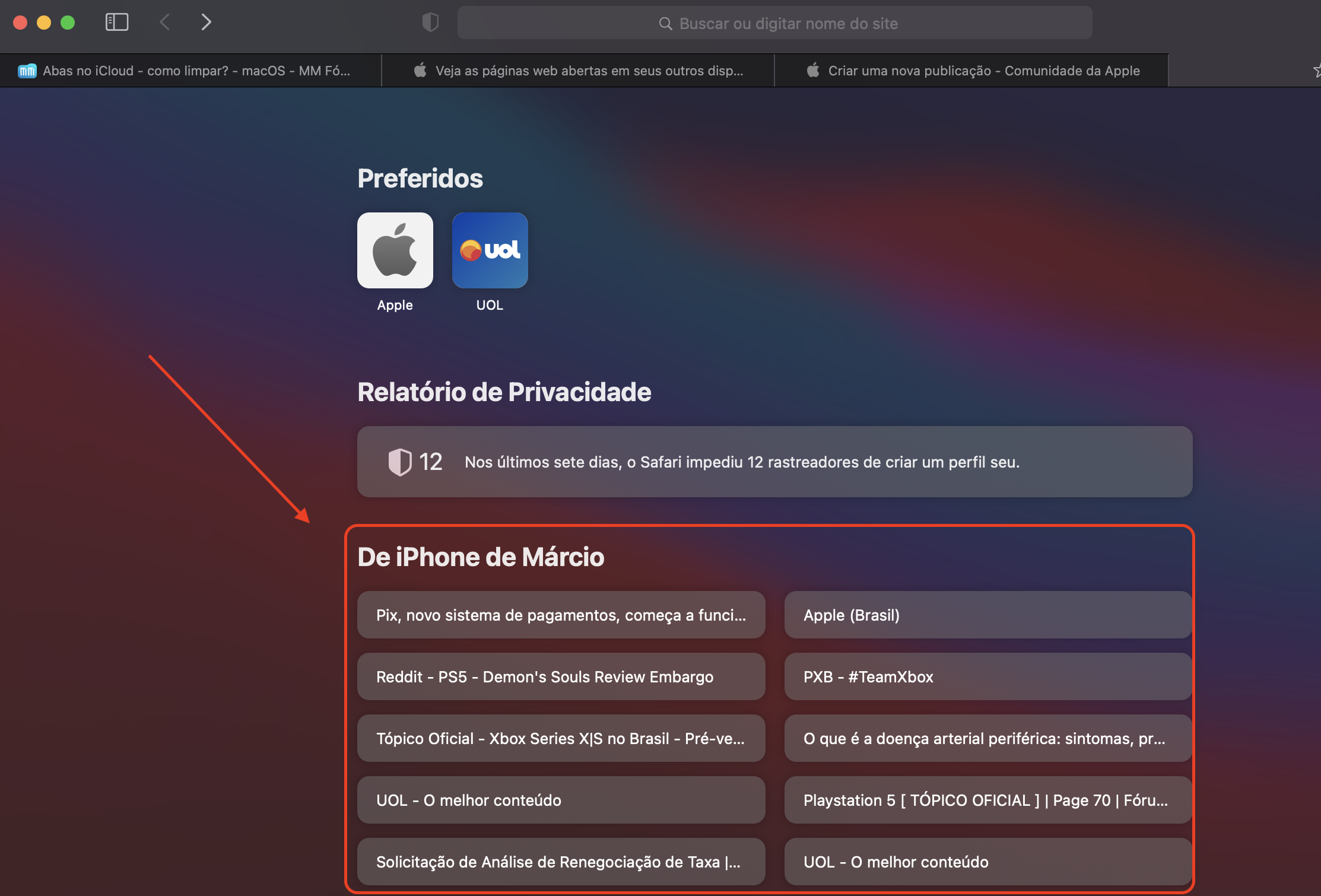 Esse problema é muito inconveniente pois simplesmente não consigo apagar isso do Safari. Pelo que entendi, o Safari demonstra nesse local abas que estão abertas em outros dispositivos, por exemplo, meu iPhone... mas não tem aba aberta no meu celular... de onde que o safari do meu Mac está puxando isso?