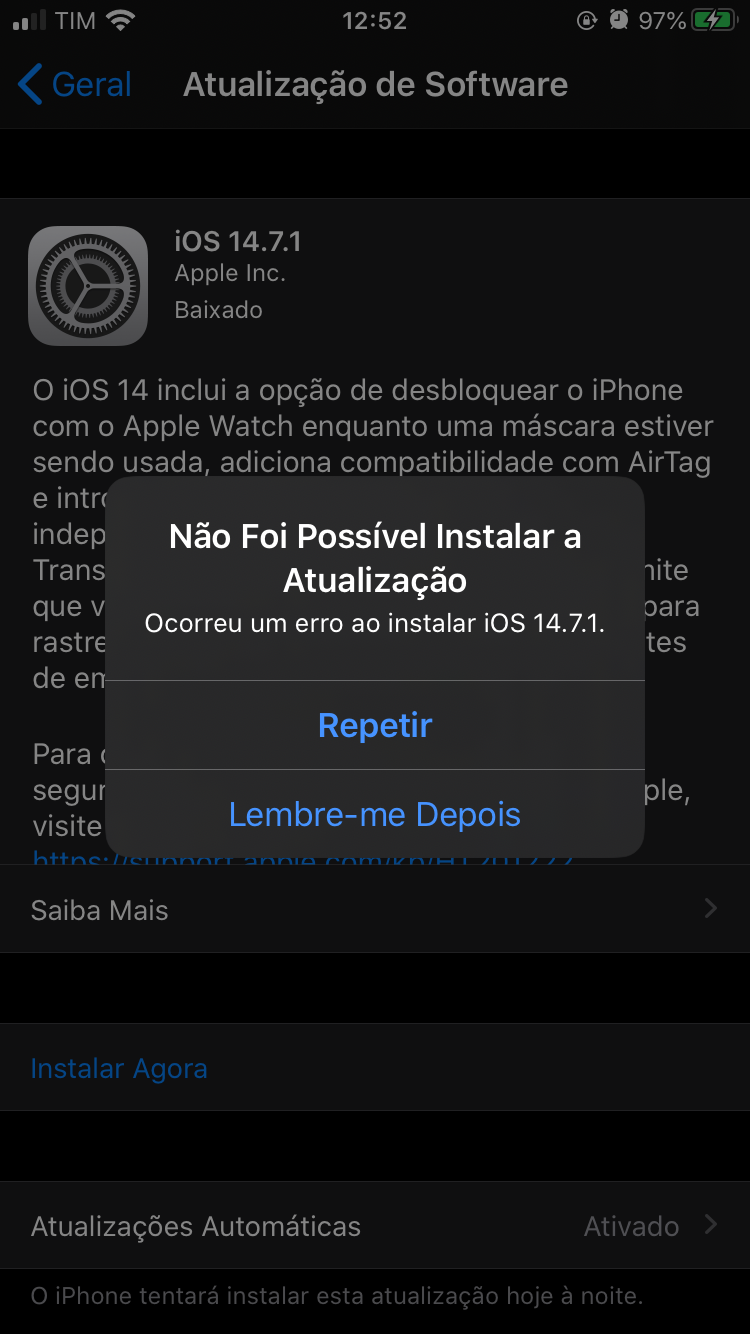 eu não consigo instalar a atualização do Software diz que acorreu um erro e não instala