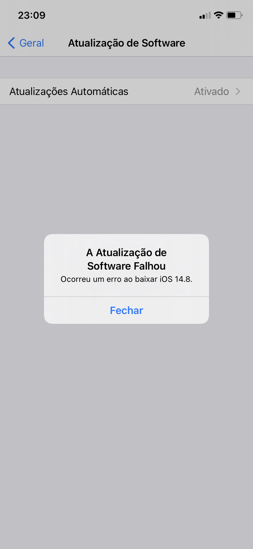 Apple, eu estou tentando atualizar meu iPhone 11 para o IOS 14.8 para depois atualizar para o IOS 15 e está dando um erro com a mensagem: “ATUALIZAÇÃO DE SOFTWARE FALHOU. ocorreu um erro ao baixar IOS 14.8”! Já tentei umas 3 vezes e da o mesmo erro.