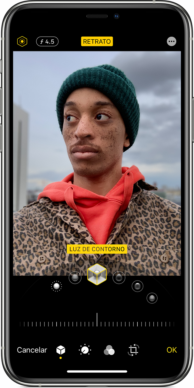 No iPhone X e posterior e no iPhone 8 Plus, você pode usar o recurso Iluminação de Retrato para aplicar efeitos de iluminação com qualidade de estúdio às imagens no modo Retrato. Selecione Luz de Estúdio para clarear os traços faciais, Luz de Contorno para usar uma iluminação direcional mais dramática, Luz de Palco para isolar o objeto sob a luz de um holofote, Palco Mono para aplicar uma luz de palco em preto e branco clássico ou Luz Brilhante Mono para deixar o objeto em escalas de cinza contra um plano de fundo preto e branco.