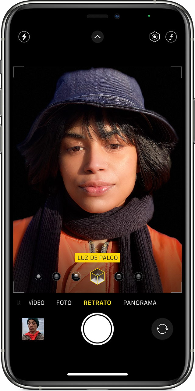 Você pode tirar uma foto no modo Retrato com uma pré-visualização em tempo real do efeito de iluminação na tela. Com o app Câmera no modo Retrato, deslize entre os diferentes efeitos de iluminação que aparecem na parte inferior do visor. A imagem fotografada no modo Retrato terá o efeito de iluminação aplicado.
