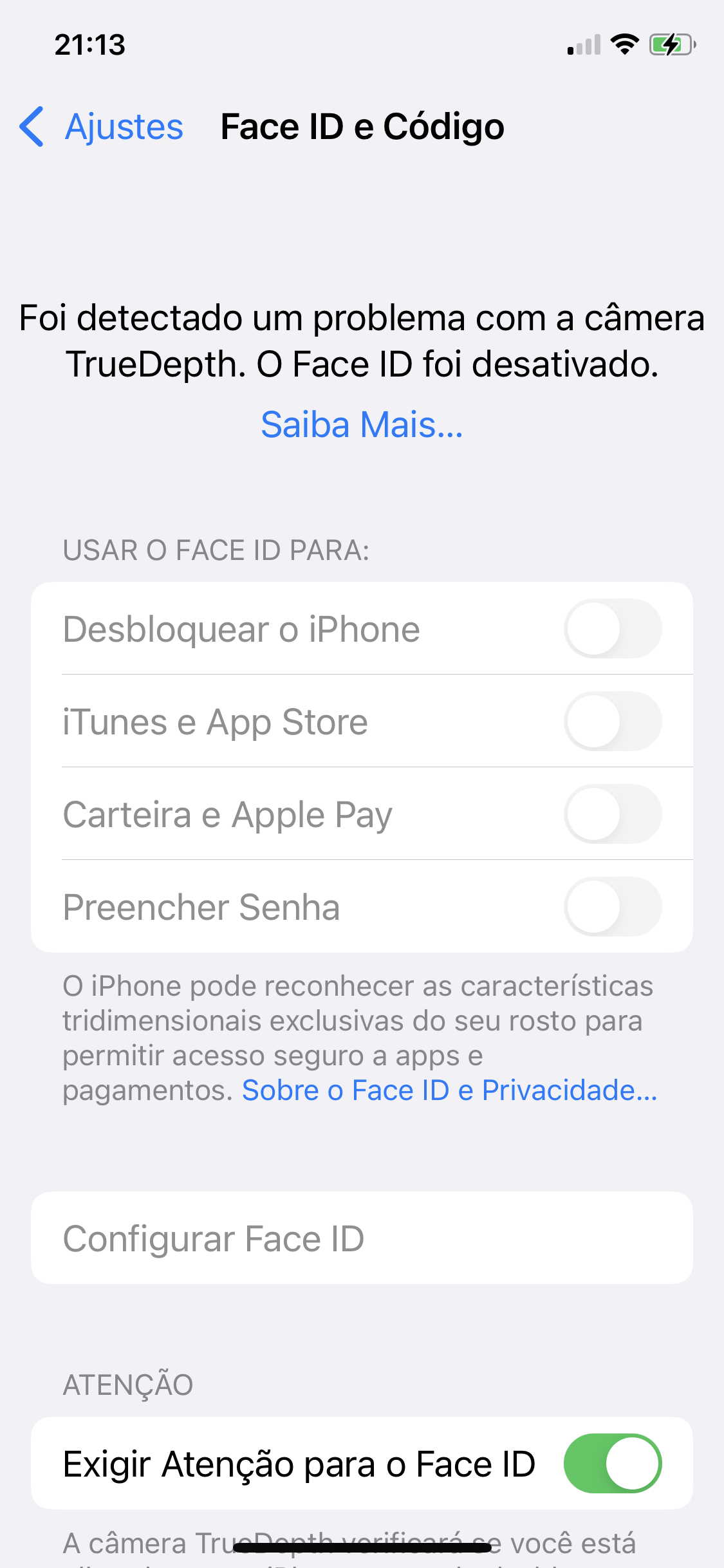 Meu Face ID parou de funcionar após uma queda e ficou uma mancha encima da câmera,troquei o display mais continua não funcionando,já atualizei para a versão mais recente e nada