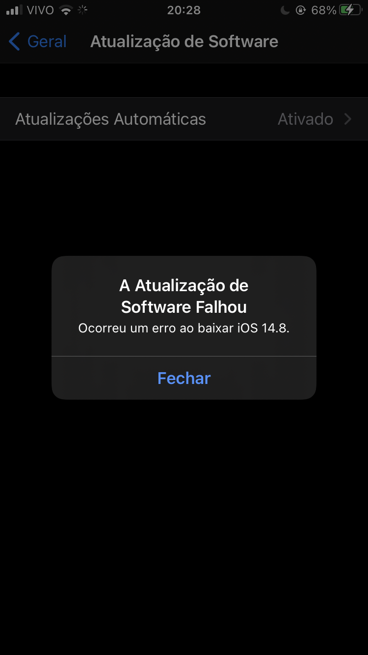 Tento atualizar meu iPhone 8 mas aparece a seguinte mensagem “A Atualização de software falhou, ocorreu um erro ao baixar ios 14.8” o que eu faço?