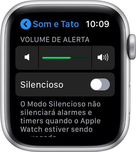 3. Toque no botão de abaixar o volume  para abaixar o volume ou toque no botão de aumentar o volume  para aumentá-lo. Você também pode tocar no controle deslizante e girar a Digital Crown.