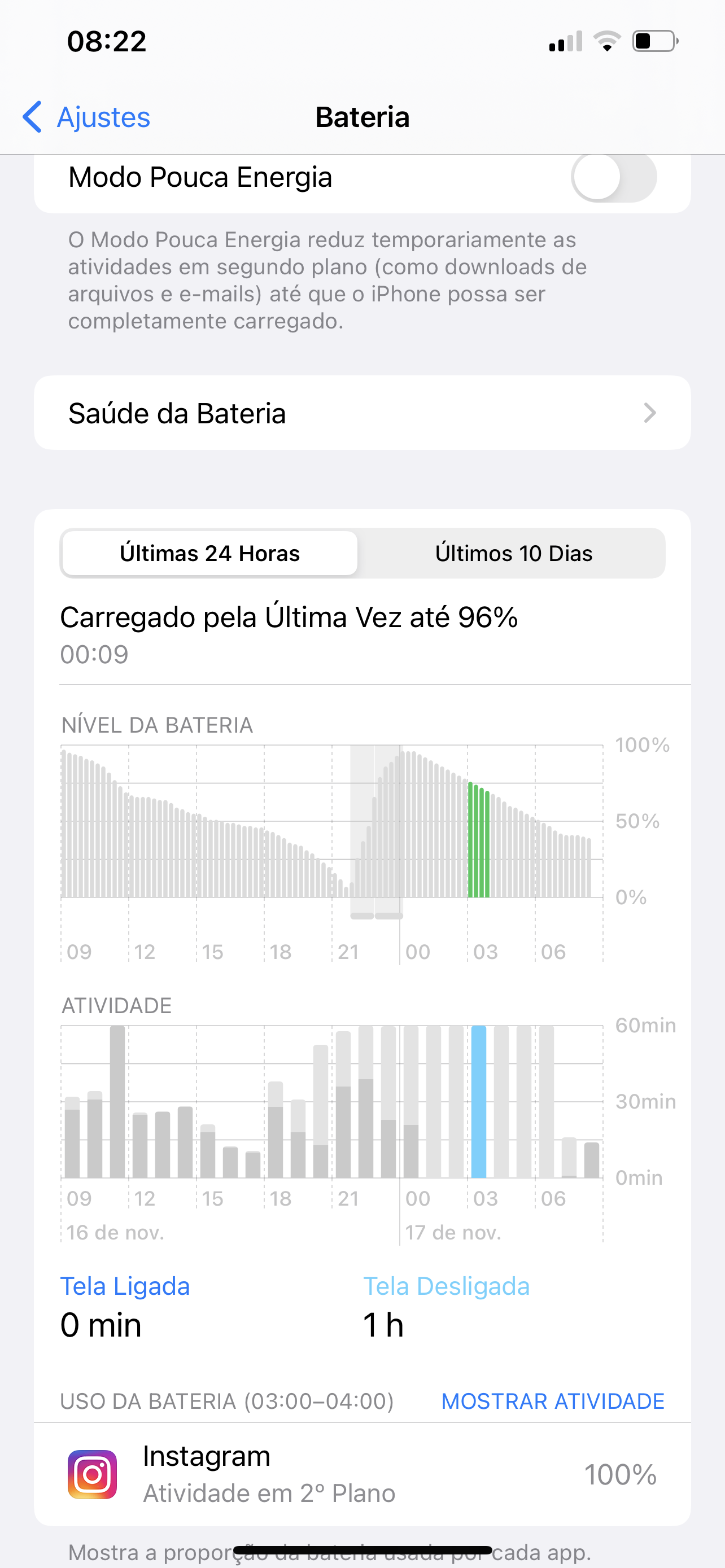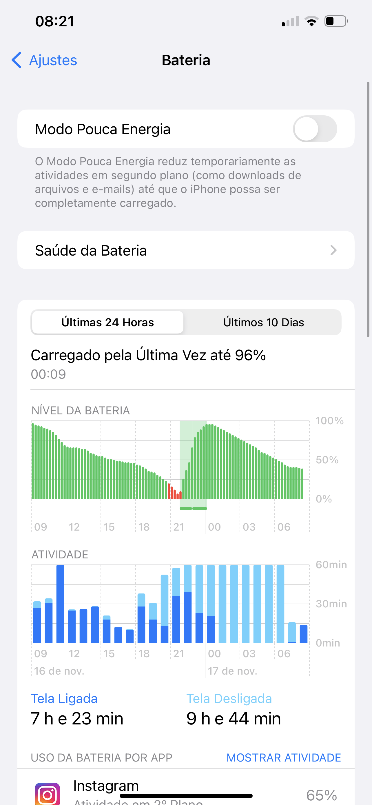 Bom dia! Comprei meu iPhone há cerca de 3 meses e hoje tomei um susto: dormi com ele carregado 100% e acordei com a bateria a 40%! Detalhe que Wi-Fi e 3g estavam desligados. Fui ver o relatório de bateria e tinha somente a atividade do Instagram em segundo plano, o que é estranho pois não havia internet.