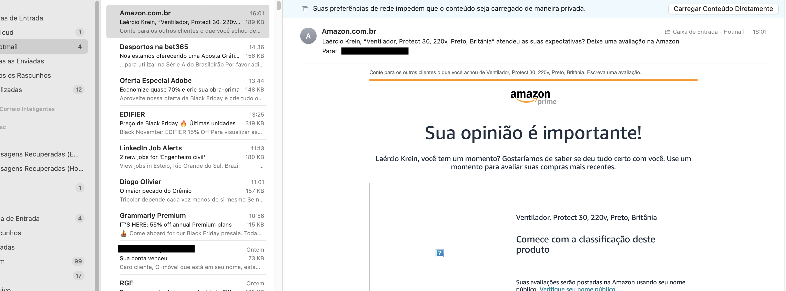 Olá, tenho enfrentado esse problema a alguns dia, onde e-mails com alguma imagens( elas precisam ser baixadas manualmente) aparece a mensagem "suas preferências de rede impedem que o conteúdo seja carregado de maneira privada" e aparece o botão "carregar conteúdo diretamente". Isso acontece no app do Mail no IOS e no macOS, independente do provedor (hotmail ou iCloud).