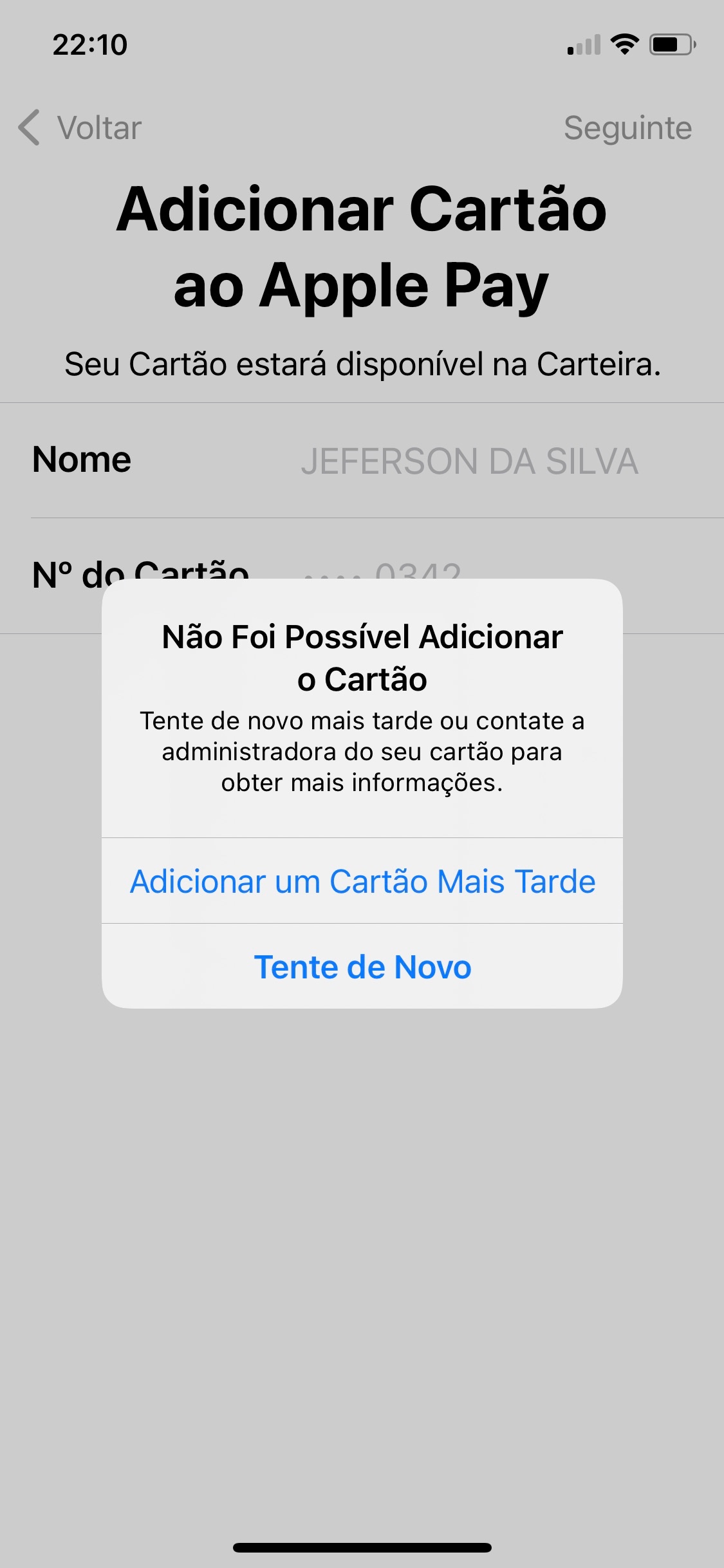 Não consigo adicionar cartão na Apple Pay do iPhone