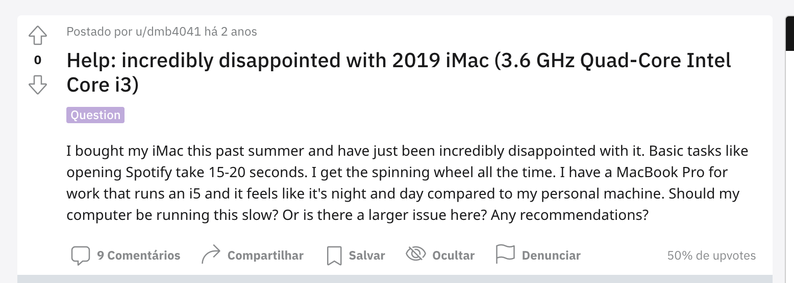 Aqui um consumidor chegou a fazer um video comparando o iMac 2019 e um antigo para mostrar o quão lento ele é para vocês verem que não é exagero: https://www.youtube.com/watch?v=AidbJIQJono