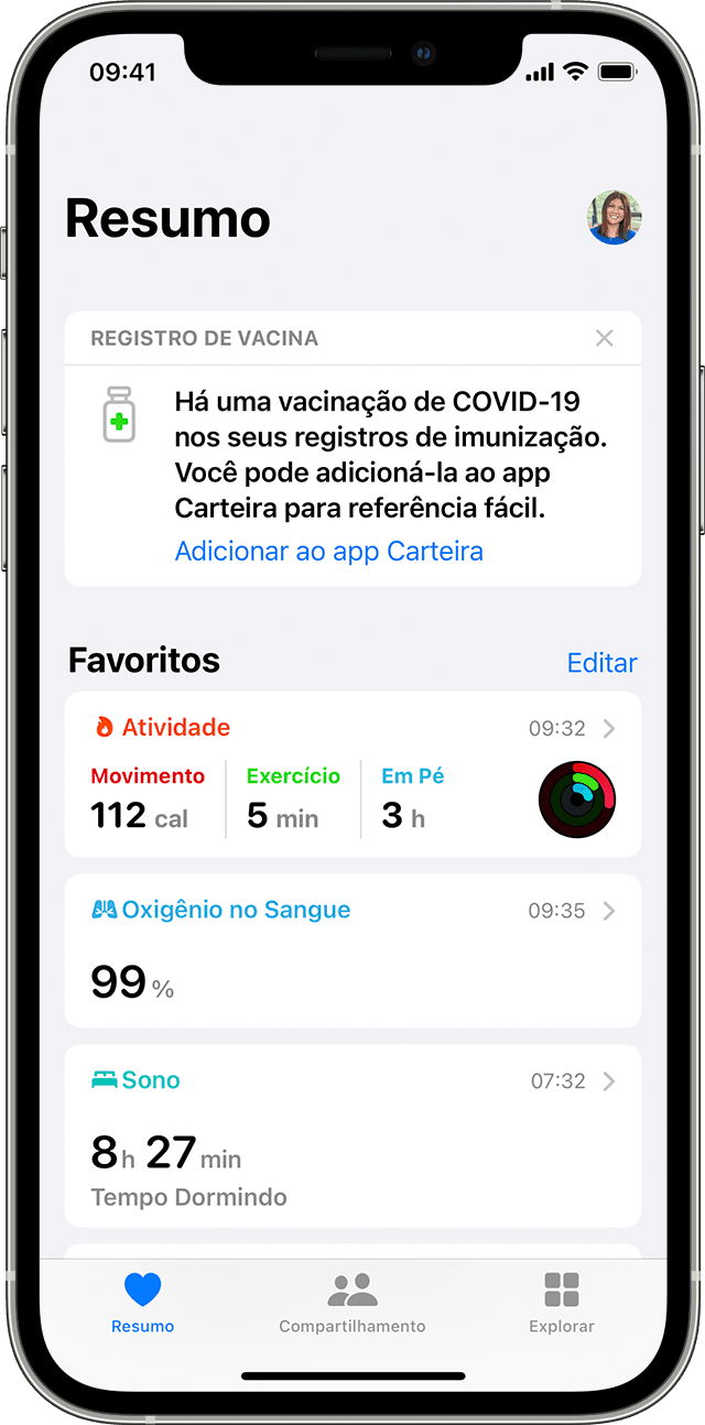 Com o iOS 15.1, você pode baixar e armazenar com segurança informações verificáveis sobre a vacinação contra COVID-19 no app Saúde e adicionar um cartão de vacinação ao app Carteira.*
