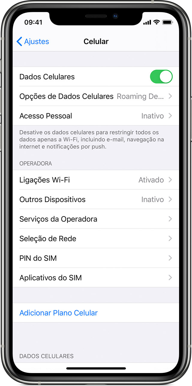 Para ativar ou desativar os dados celulares, acesse "Ajustes" e toque em "Celular" ou "Dados Móveis". Em um iPad, acesse Ajustes > Dados Celulares. Se você estiver usando um iPhone com Dual SIM, será preciso definir um dos planos como o número de dados primário para ver o quanto de dados celulares já foi usado.