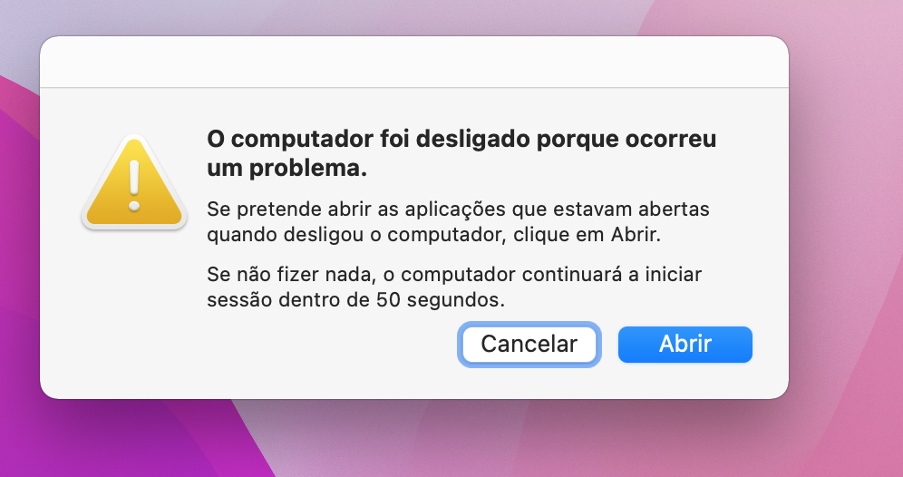 Sempre que ligo ou reinício o meu Mac aparece sempre um aviso a dizer que o computador foi desligado porque ocorreu um problema