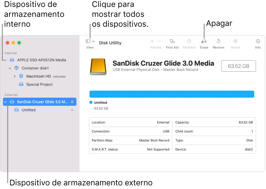 No Utilitário de Disco no Mac, você pode apagar e reformatar dispositivos de armazenamento para usar com um Mac. O apagamento de um dispositivo de armazenamento apaga tudo o que estiver nele.