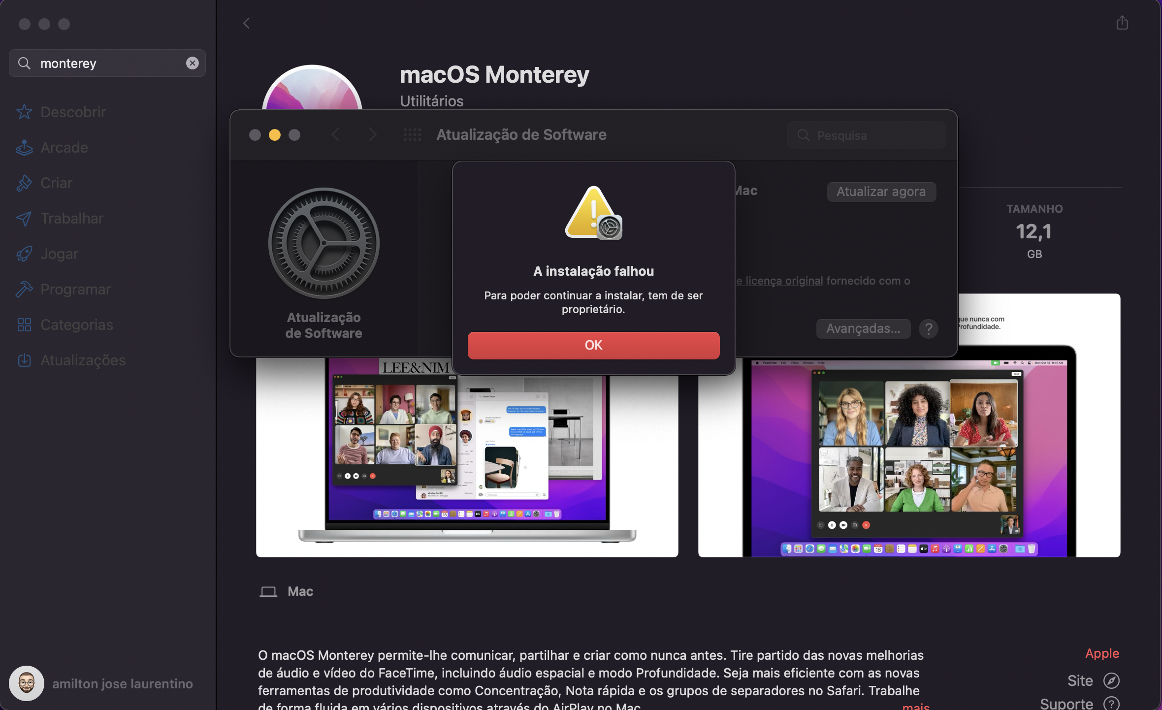 Erro ao Instalar actualização macOs Monterrey 12.1