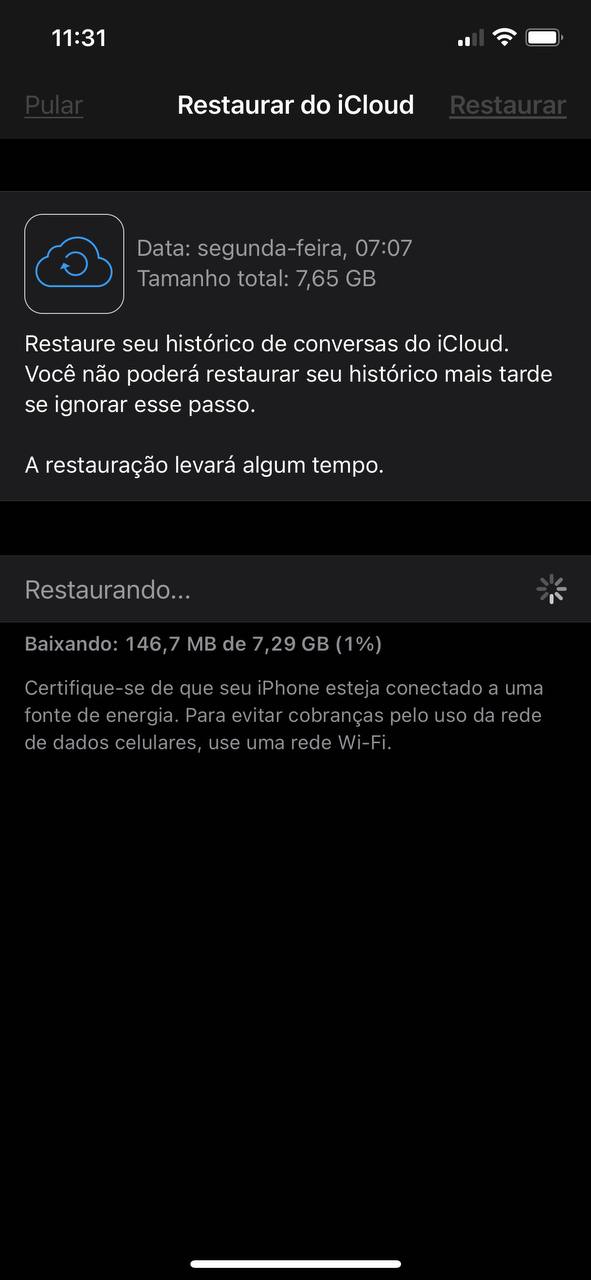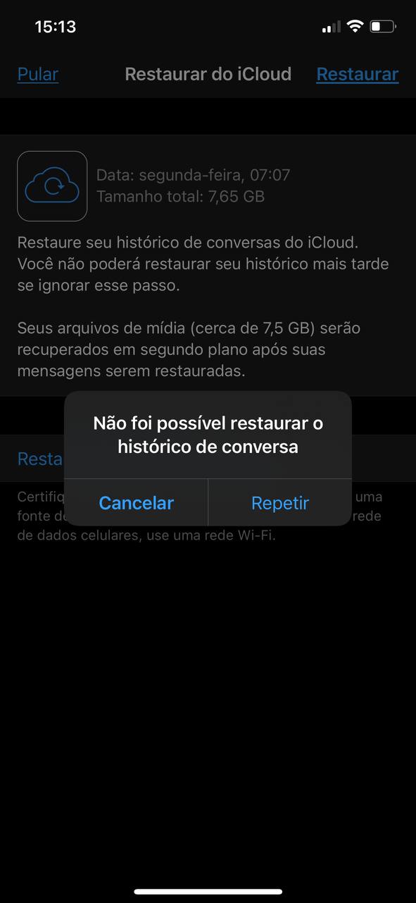 Já restaurei o aparelho, puxei novamente o mesmo backup do iCloud e novamente não consigo restaurar as conversas do whatsapp.