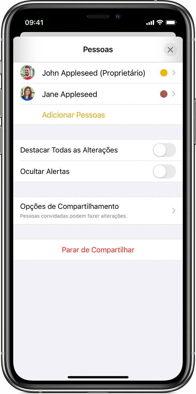 Quando uma nota compartilhada for atualizada, todos na nota receberão uma notificação de que uma atualização foi feita. Para ocultar essas notificações, toque no botão Adicionar Pessoas