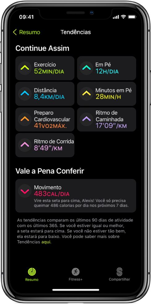 Se a seta de Tendência de uma determinada métrica apontar para cima, isso indica que você está mantendo ou melhorando seu condicionamento físico. Se uma seta apontar para baixo, sua média de 90 dias para essa métrica começou a diminuir. Para motivá-lo a melhorar suas tendências, você receberá um treino: “Ande mais 500 metros por dia”, por exemplo.