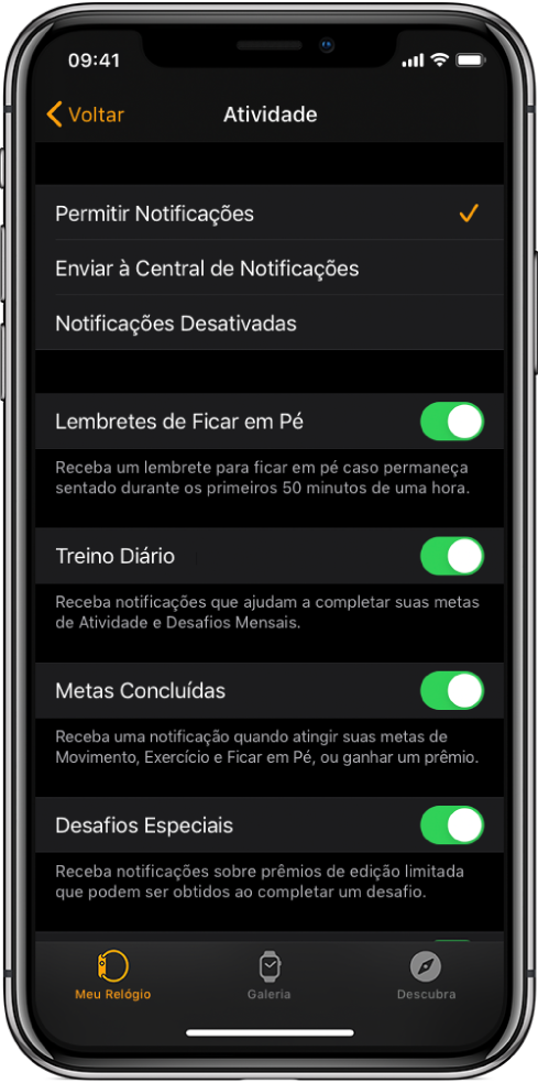 Lembretes podem ser úteis quando se trata de atingir metas. O Apple Watch informa se o seu desempenho está satisfatório ou insuficiente com relação às suas metas de atividade. Para selecionar quais lembretes e alertas deseja ver, siga estes passos: