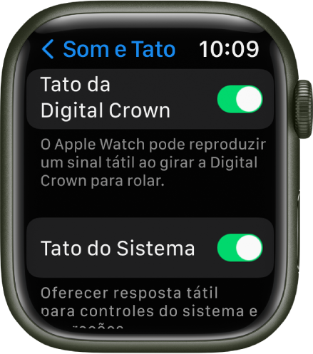 Ou, no iPhone, abra o app Apple Watch, toque em Meu Relógio, toque em “Som e Tato” e ative ou desative Crown Haptics.
