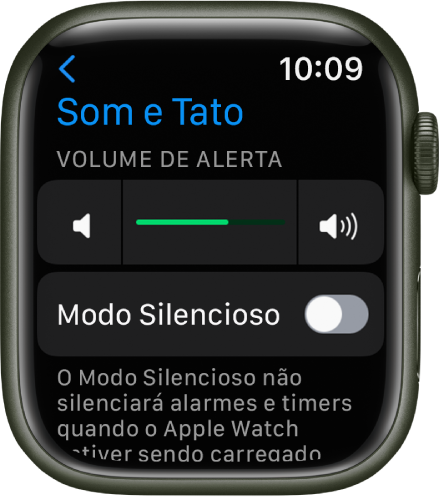 Ou, no iPhone, abra o app Apple Watch, toque em “Som e Tato” e arraste o controle deslizante Volume de Alerta.