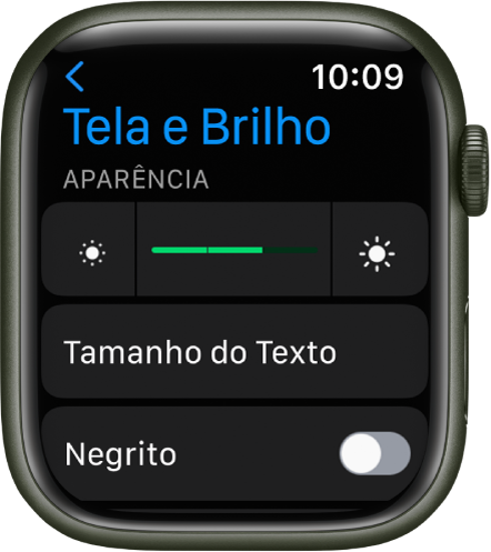Abra o app Ajustes  no Apple Watch, toque em “Tela e Brilho” para ajustar: